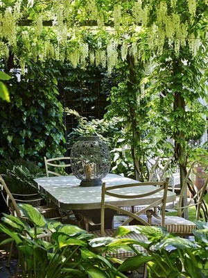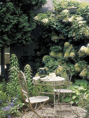 Là où l’espace manque, ou si la terre est difficile, des plantes grimpantes suffisent à évoquer cette ambiance douce. Une glycine, un chèvrefeuille, un rosier ancien enjambent la clôture et gomment la séparation avec le voisinage.