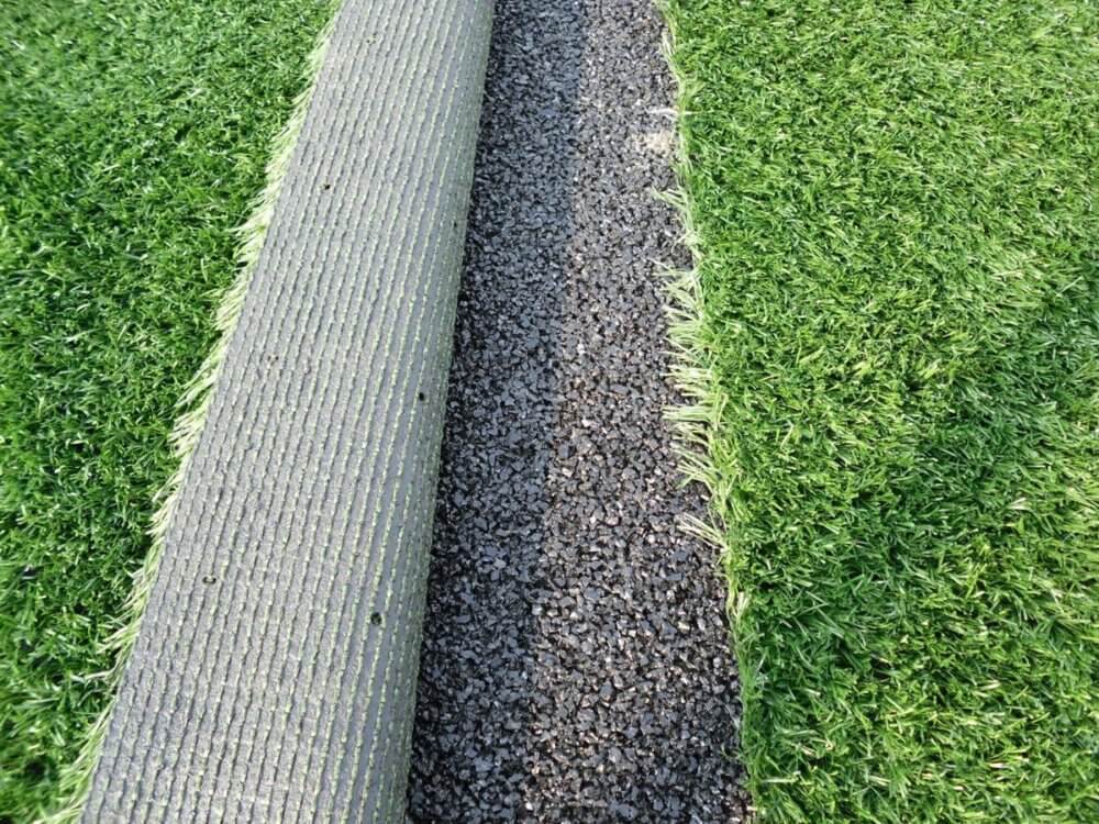 Le support doit être parfaitement plat. Si c’est le cas, l’installation est rapide : il suffit de coller les joints des lès de gazon avec un ruban spécial. Idéalement, choisissez un rouleau large pour limiter les raccords et simplifier la découpe.